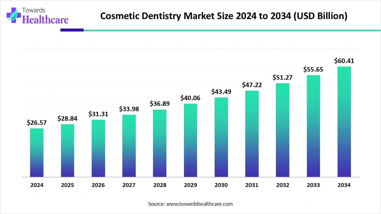 Ottawa, Oct. 03, 2025 (GLOBE NEWSWIRE) -- The global cosmetic dentistry market size was valued at USD 26.57 billion in 2024 and is predicted to hit around USD 60.41 billion by 2034, rising at a 8.55% CAGR, a study published by Towards Healthcare a sister firm of Precedence Research.